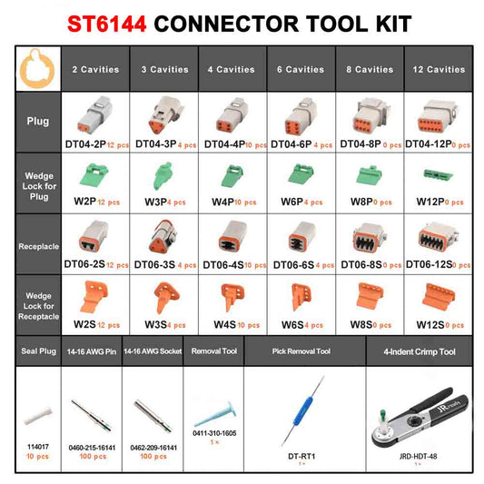JRready ST6144 333PCS DT Connector Kit(Deutsch Connectors Kit) 2 3 4 6 Pin Connectors & 16# Solid Contacts Terminals & JRD-HDT-48 Crimper(DEUTSCH HDT-48-00) 12-22AWG