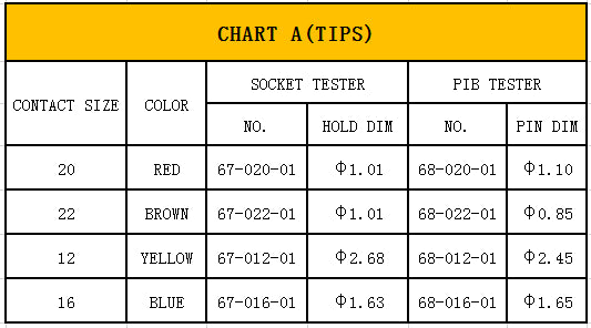 These tools check the retention of pins and sockets in electrical connectors by indicating when propper pressure has been applied. Each tool body is set for a different poundage range (see chart A on back of this page). The tester tips are color coded for specific sizes and designated for pins or sockets. Use pin end tipes to test sockets and socket end tips to test pins. All tips are replaceable.