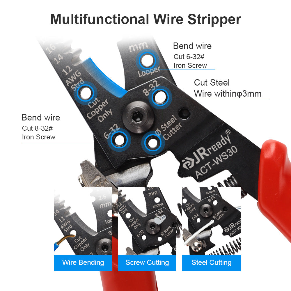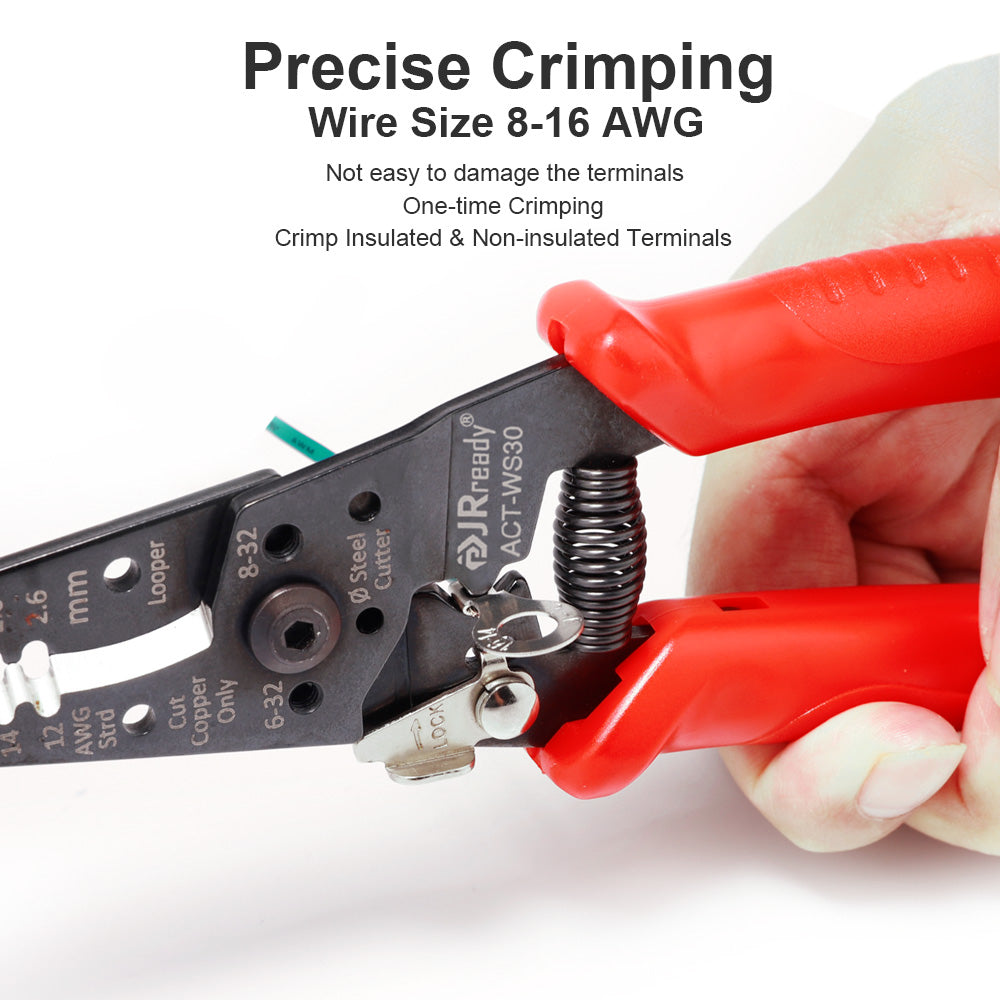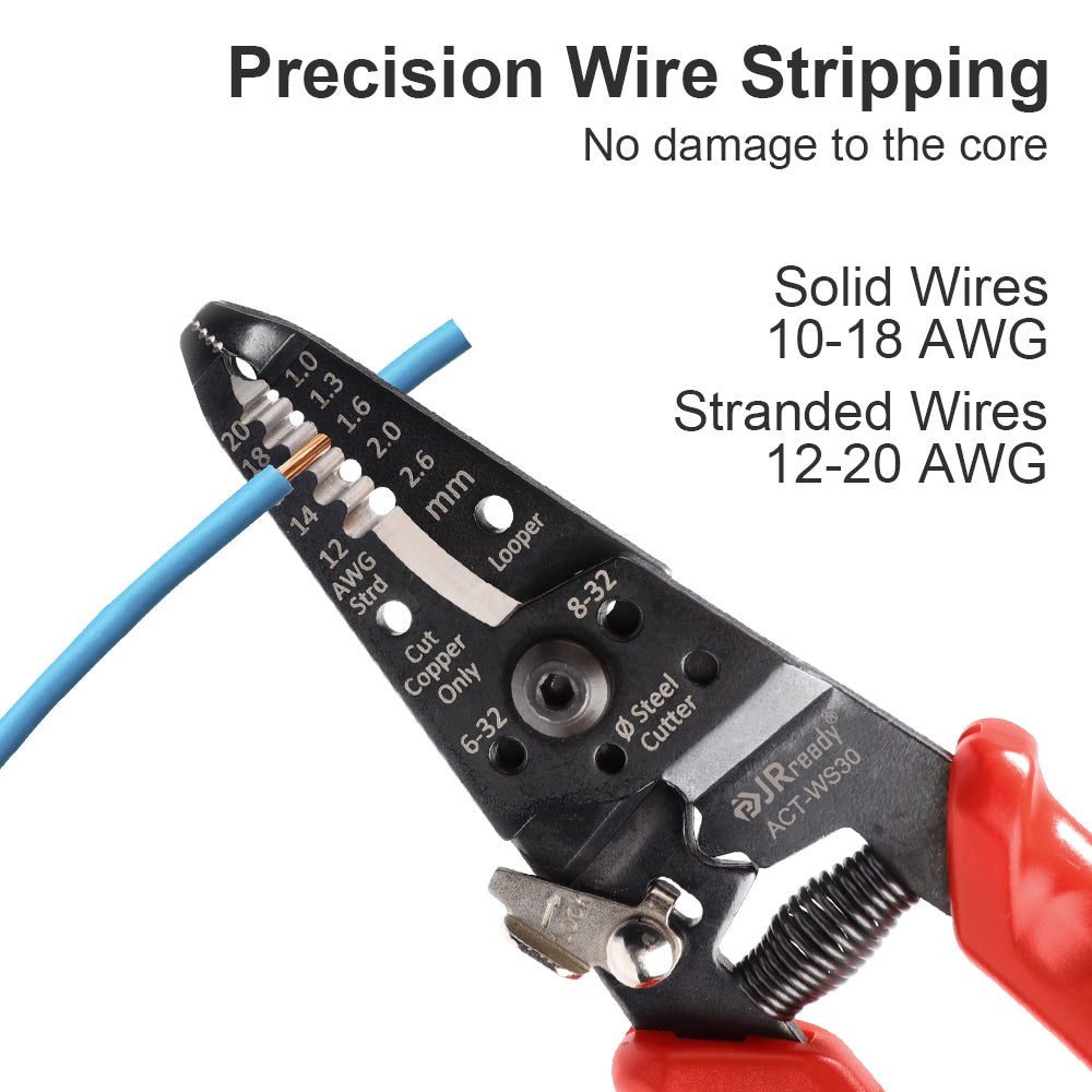 JRready ACT-WS30 Multifunctional Precision Wire Stripper Crimper Cutter, Strip Wire Solid 10-18 AWG, Stranded 12-20 AWG,Crimp 8-16 AWG Terminal, Cut Steel Wire