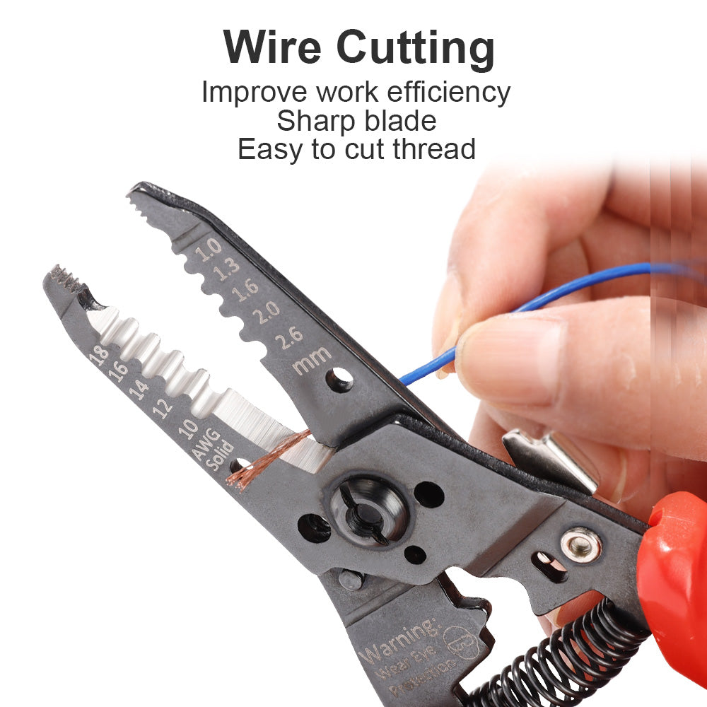 Multifunctional Wire Stripper & Crimper * Cutter: strip solid wire 10-18 AWG; strip stranded wire 12-20 AWG; crimp 8-16 AWG terminal, cut copper, soft aluminum wires, small size steel wires;