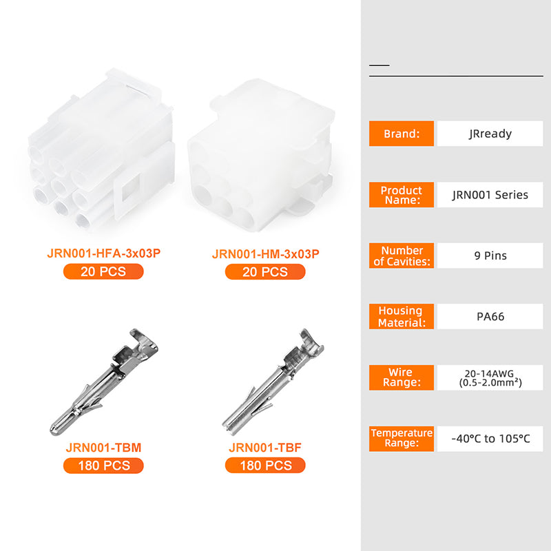 JRready MOLEX Connector JRN001 9 Pin (20Matched Sets), 2.13mm Diameter Sockets 14-20 AWG, Compatible with Molex MLX Power Connector, 6.35mm Pitch, Free Hanging(20 sets)