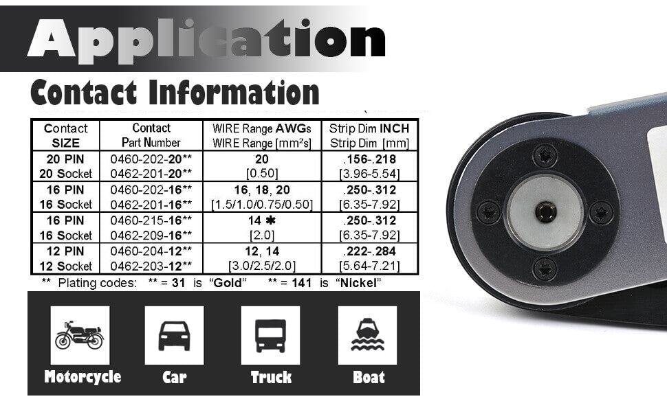 - 【Contact information】 Size 12,16,20, Numbers Beginning With 0460 (Pin) and 0462 (Socket) Solid Contacts.